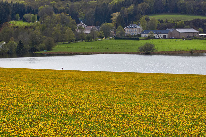 Mon frère était allé évaluer le potentiel du lac en matière de pêche. Il a eu la bonne idée de jeter son dévolu sur le coté le plus photogénique, avec ce champ couvert de pissenlits. A presque 600m d'altitude, la végétation est moins avancée que dans la plaine de la Saône. Les jonquilles sont en pleine floraison mais je n'ai pas eu l'occasion d'en voir beaucoup. L'escapade était improvisée, le temps d'un après-midi, et la fenêtre météo pour une belle lumière a été plus courte encore.