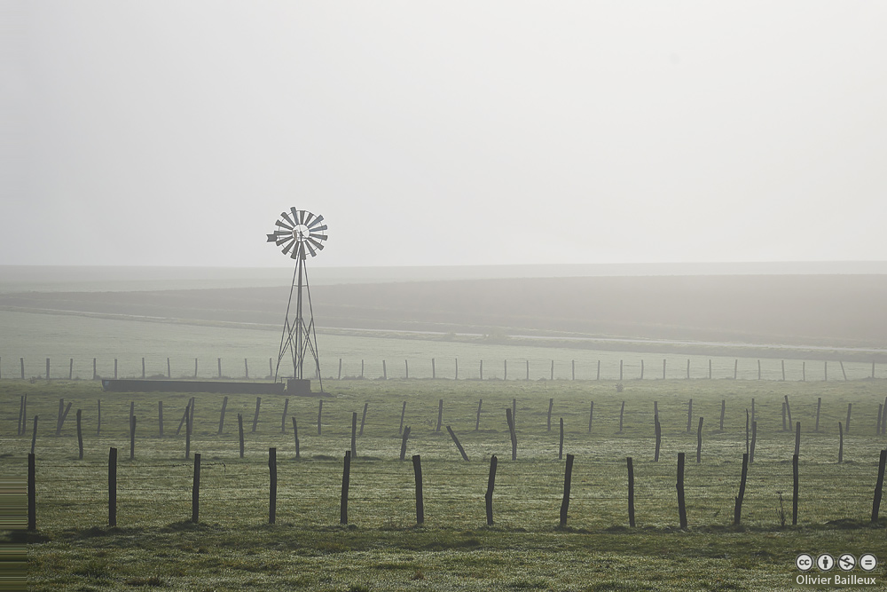 Ces photos résument toute mon enfance : brouillard, piquets de pâture, éolienne. Impressionnant tout ces alignements rapprochés de piquets sur la 2 et la 5.